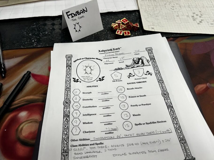 So I rolled up stats, 3d6 down the line. 11, 11, 10, 9, 9, 7. Absolutely nothing special there except a slightly low Charisma (more on that soon), but I got a good roll and started with 200 gold. Woot! Looking at the classes, I saw Elves were just as broken as I remembered them. Weapons, armor, spells, infravision, detecting secret doors, immunity to paralysis from ghouls, and pointy ears…they’ve got it all. Yeah, you need gads of XP to level, but as I’m not sure I’ll be able to make more than one session, it was the easy (and overpowered) choice to go with. Introducing Finean, the Sage, an elf who is so obessed with lore than he goes on and on and tends to bore people (hence the low Charisma). I took Read Languages and Sleep (in addition to Read Magic that all elves and magic users get), bought a ton of gear (woot, splint mail at 1st level!) and I was set. No backstory, I was going to create that in game to suit whatever was happening. I knew he’d care about the Fount of Law, but waited to decide the particulars.