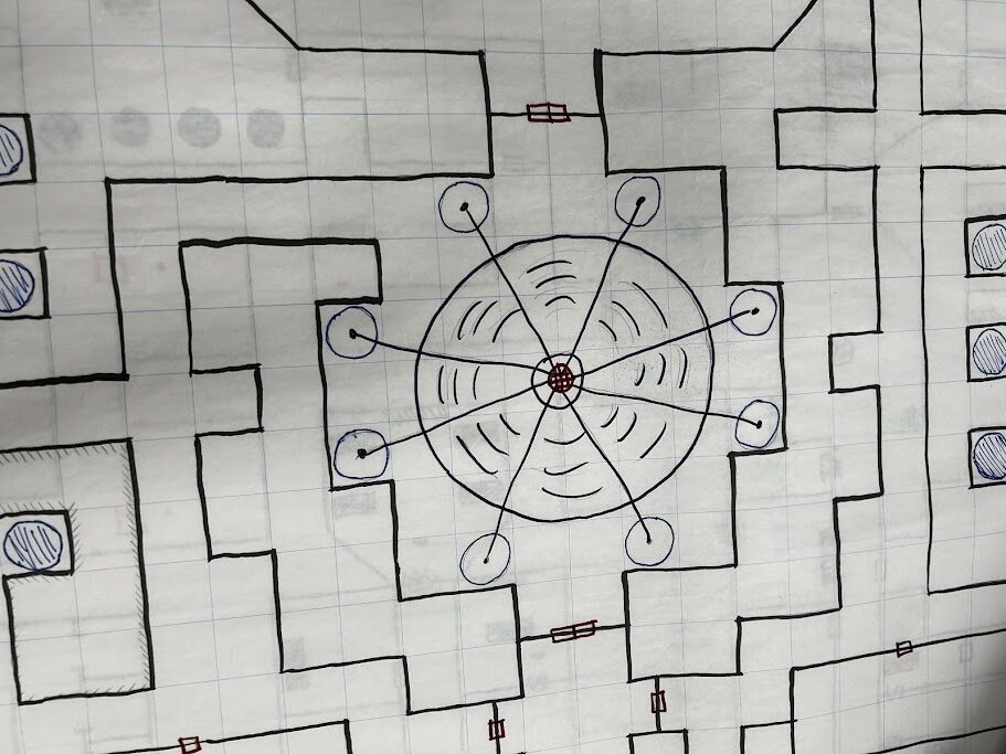 We listened around the corner and heard four men walking. Everyone but Finean and Clearance scooted back behind the door, so we could listen to them in the dark. They walked past in hooded robes and skull masks and bones stitched into their robes. The seemed to be scouting the area. Finean made a bold move believing they were servants of Nergal. “Brothers! I got lost and separated by this pit. Life in Death is from Nergal. Praise Nergal!”