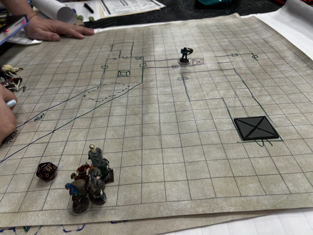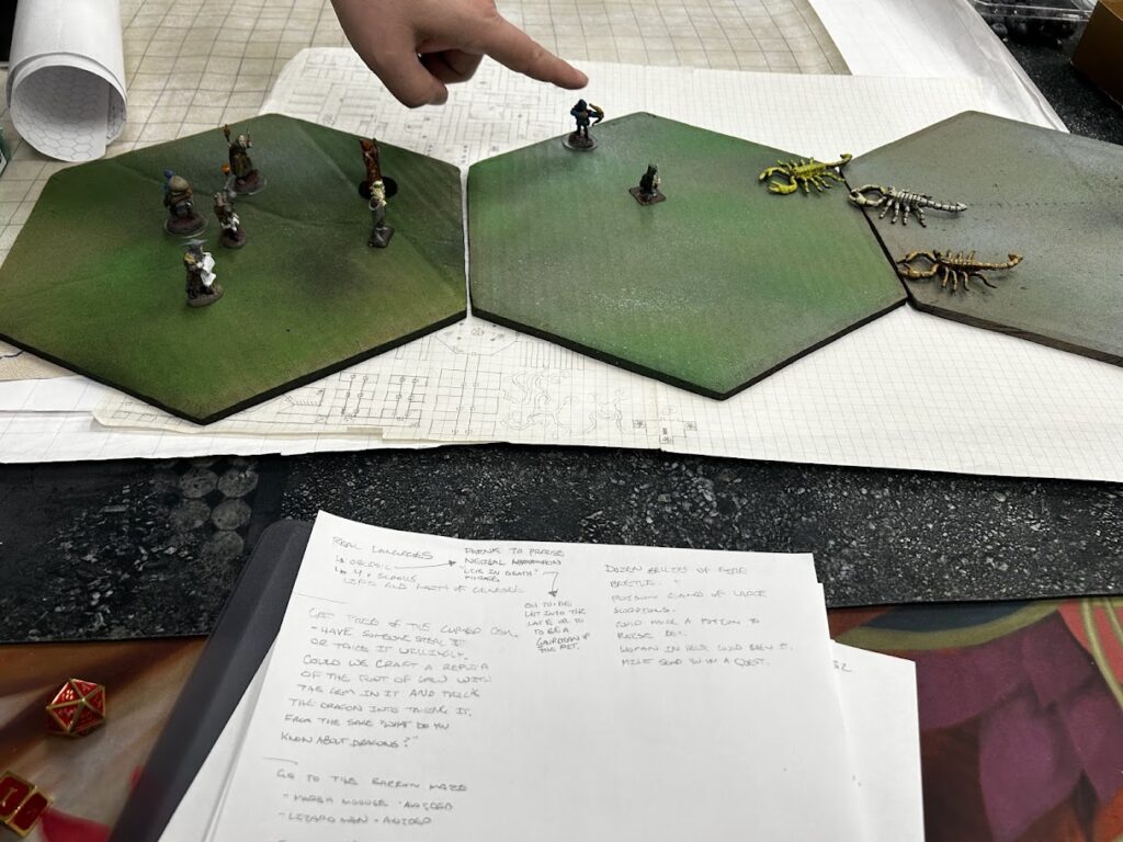 After that we boogied out of town. We lost one torchbearer to the house flies and another to a pack of two scorpions that ambushed us on the way out. Our hireling fees aren’t going down anytime soon!