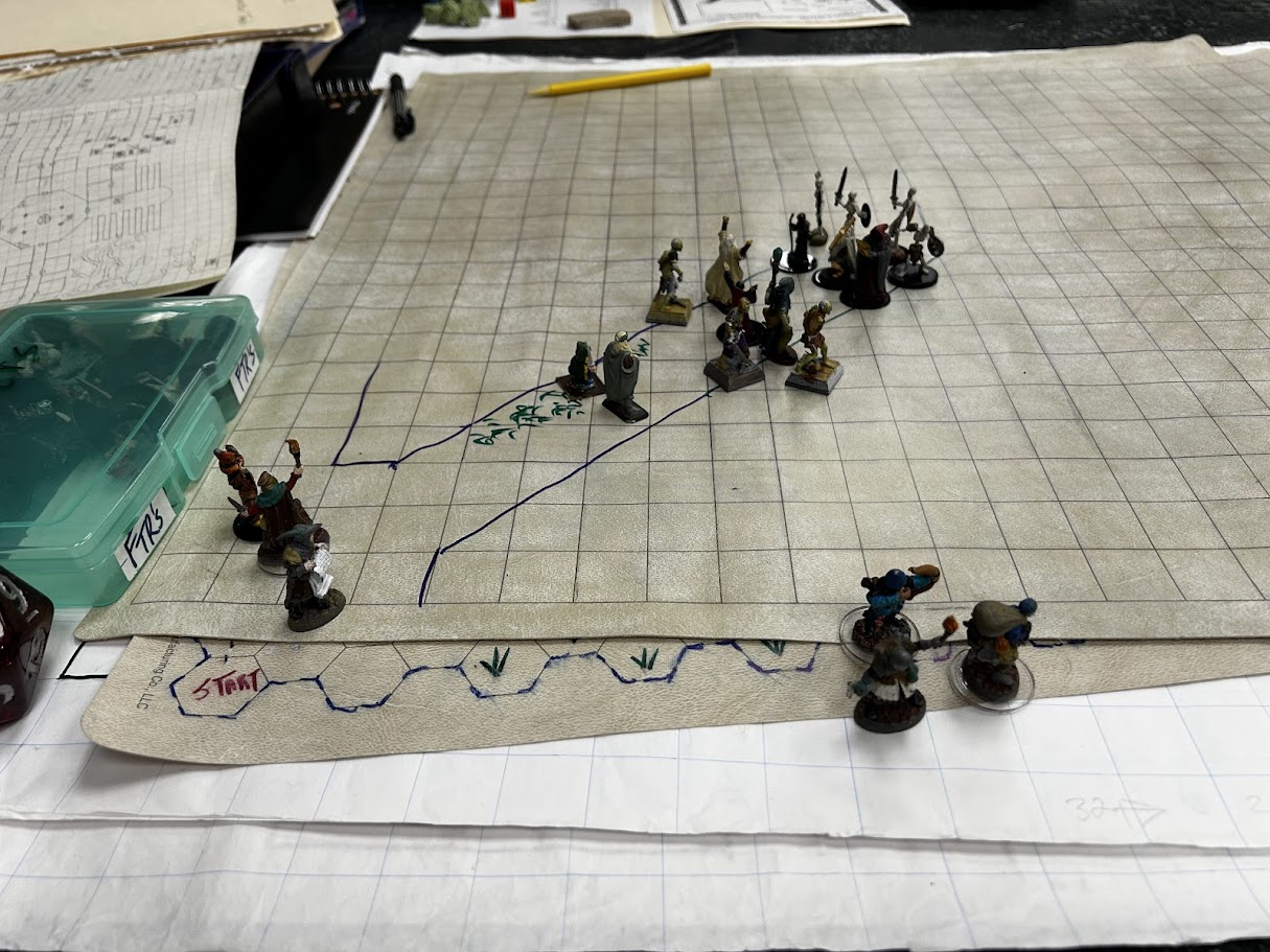 We traveled up the large hallway that the party had avoided in the past and encountered two groups who were arguing with each other. One appeared to be clerics flanked by zombies, the other necromancers flanked by skeletons.