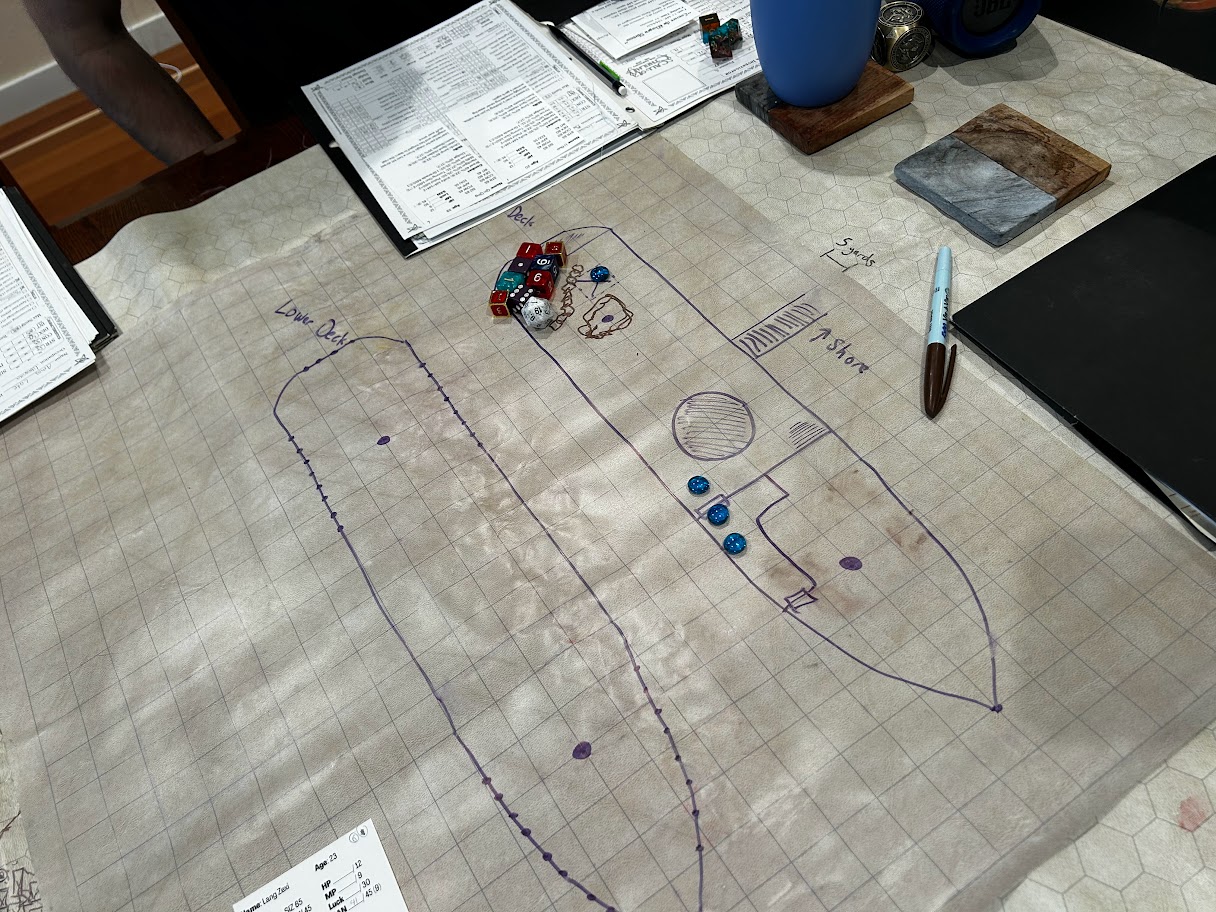 Chu Min, leader of the Firm Action Committee (FIC), led two teams onto the Dark Mistress, and commanded them to used the sandbags on board to create a barricade and prepare for foes to emerge from the hatch nearby and the visible door…and then the drowned men began pouring out!