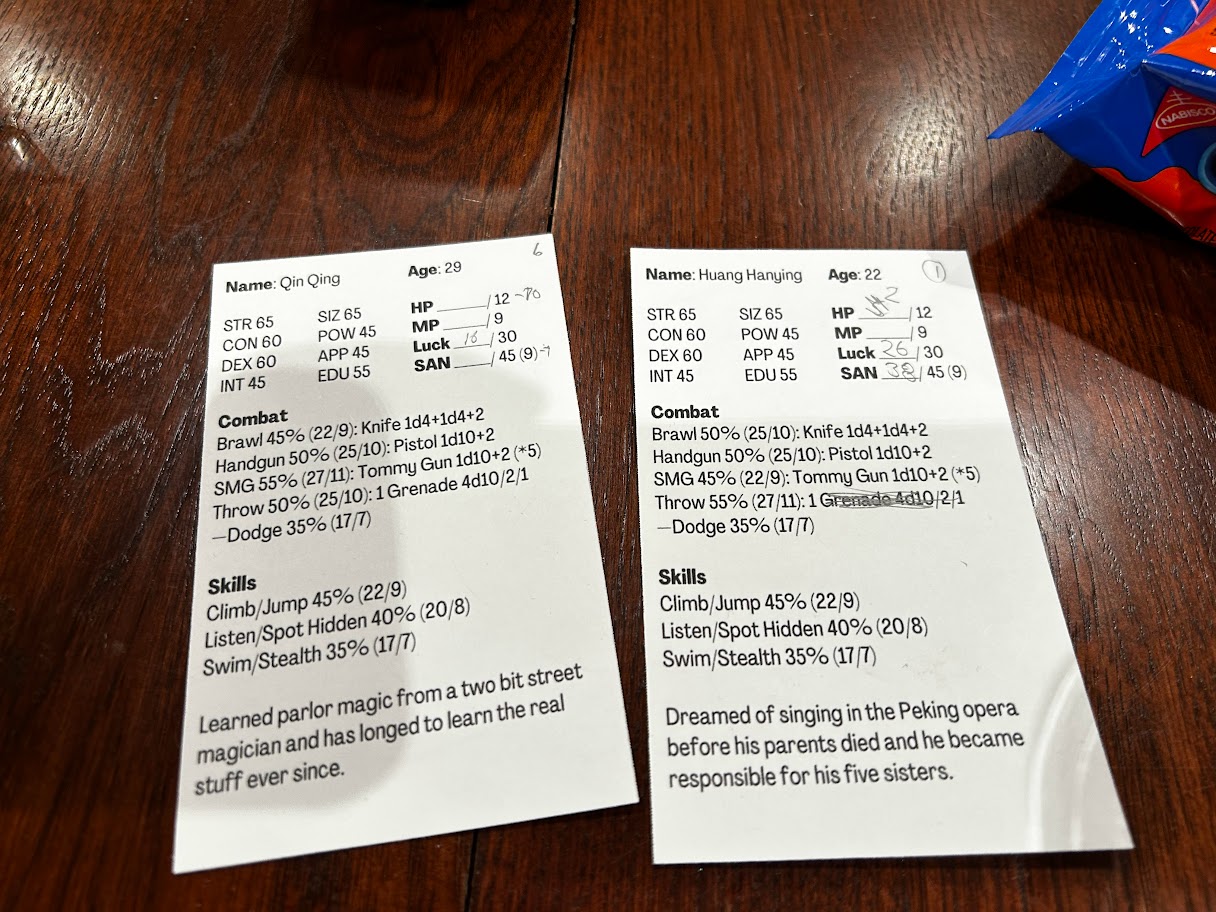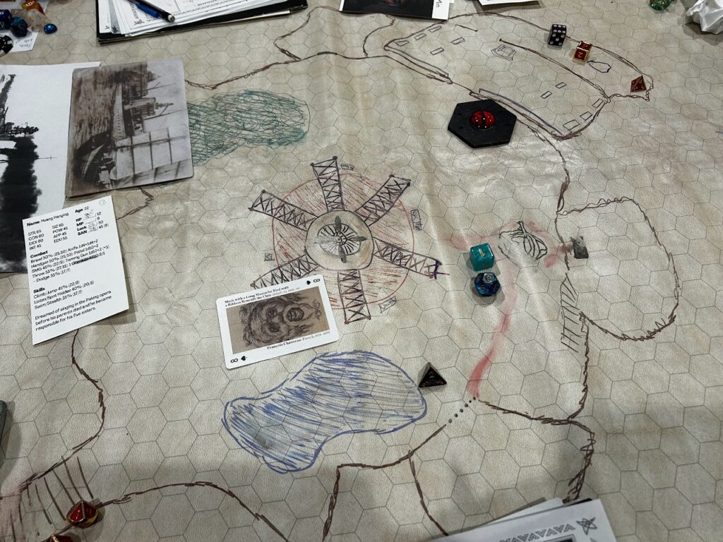 Winnie, being given access to it, read the Black Tome (which was in Hindi, so none of us could read it). It was written by a necromancer who sent his mind to Sarnath and wrote “And then shall the game be opened” and the date he was speaking of, when translated from the Hindi calendar, was January 14, 1926. Disturbed by what she had just read, Winnie threw the book down and ran out of her hotel, with Iris chasing after (we know better than to let people read alone). When Winnie was able to calm down she said she was embarrassed for her reaction, but Iris assured her it was much less severe than the reactions of others who had read such tomes.
