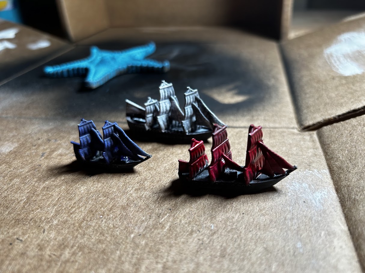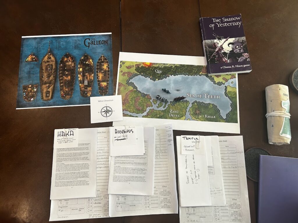 I also made some props and maps for the game. Thanks Inkarnate for the awesome map tools and Erik at Games of Berkeley for giving me some starting tips on painting minis. He suggested I go for something simple and it worked really well. The Doomed Bloodbark in red, the Sea Serpent in blue, and the Raven’s Ghost with no (just dry brushed). Finally, I made a little wind direction tracker and planned to roll 3dF to see how many degrees it changed every turn (+3 to -3 in 45 degree increments). I printed it out and used a grommet to attach the spinner.