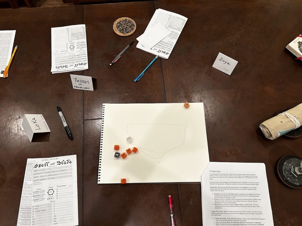 This is my first time running my own adventure for Spell and Blade (I had only run Tomb of the Twins before) and I had a blast. What’s most incredible to me about it is that the whole things came together in two days. I was reading the curse rules and suddenly the ideas that had been lingering about the temples of Kahainu clicked together. What if one of the heroes was cursed? What if they hat a really terrible curse?