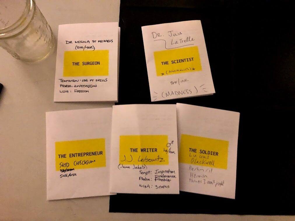 This is a game about mutating deeply flawed characters to bring them face-to-face with their deepest phobias and obsessions. Characters are defined in just a few minutes from the thing they want most and their greatest fear, and every part of the game is designed to push a wedge into their psyche to confront them with who they really are….