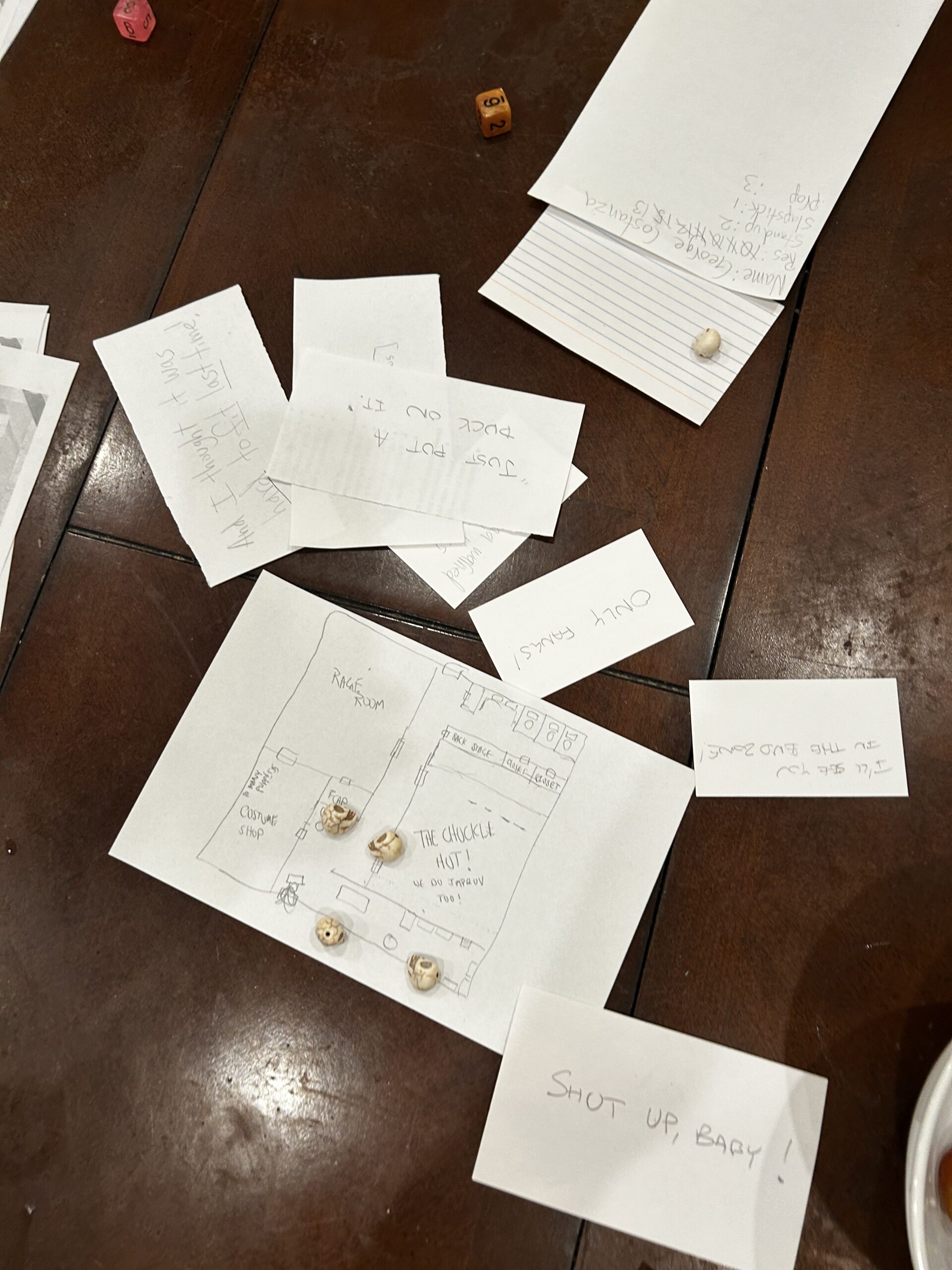 Vandpires need a 4+ (on a d6) to succeed, whereas Improvisers need a 5+ but we have a bonus of +1 to +3 (based on our stand up, slaptsick, and prop traits) so whenever opposed rolls came up, we trashed them, especially if we started Improv Chains (which gave us +1 to the roll for every person participating in the chain), I wanted to give Karen the chance to get at least one of us, but the dice gods would not intervene in her favor.